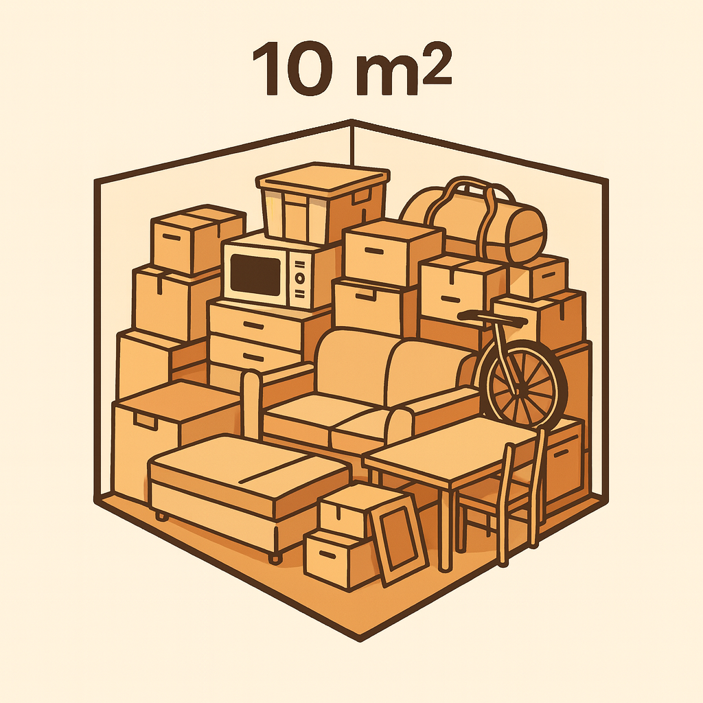 Una bodega de 10 m² ofrece un espacio amplio y versátil, perfecto para almacenar el contenido completo de un departamento o casa pequeña. Su capacidad permite organizar 40 a 60 cajas, junto a muebles grandes y artículos voluminosos, manteniéndolos seguros y ordenados.